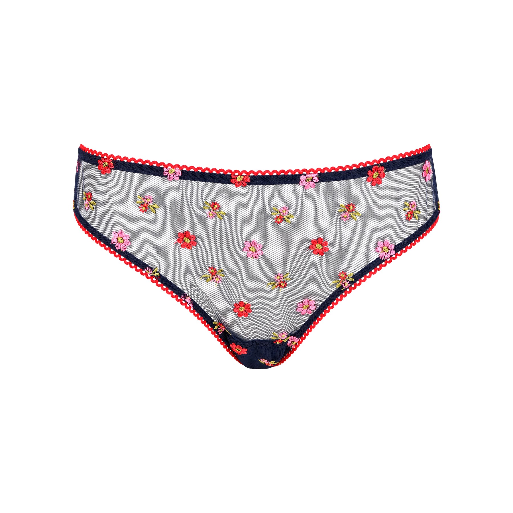 Designed in a striking combination of contrasting navy and red, this piece features delicately placed floral embroidery in shades of pink and red, artfully arranged over sheer navy-colored mesh. The result is a beautifully layered look that feels both sensual and sophisticated.